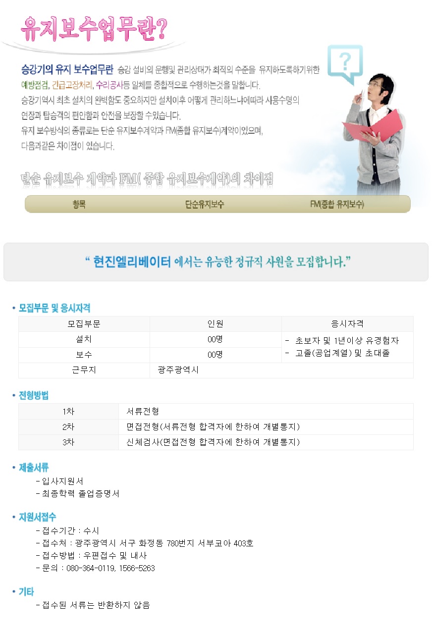 담당업무 : 승강기 설치 및 승강기 유지보수업무, 고용형태 : 정규직